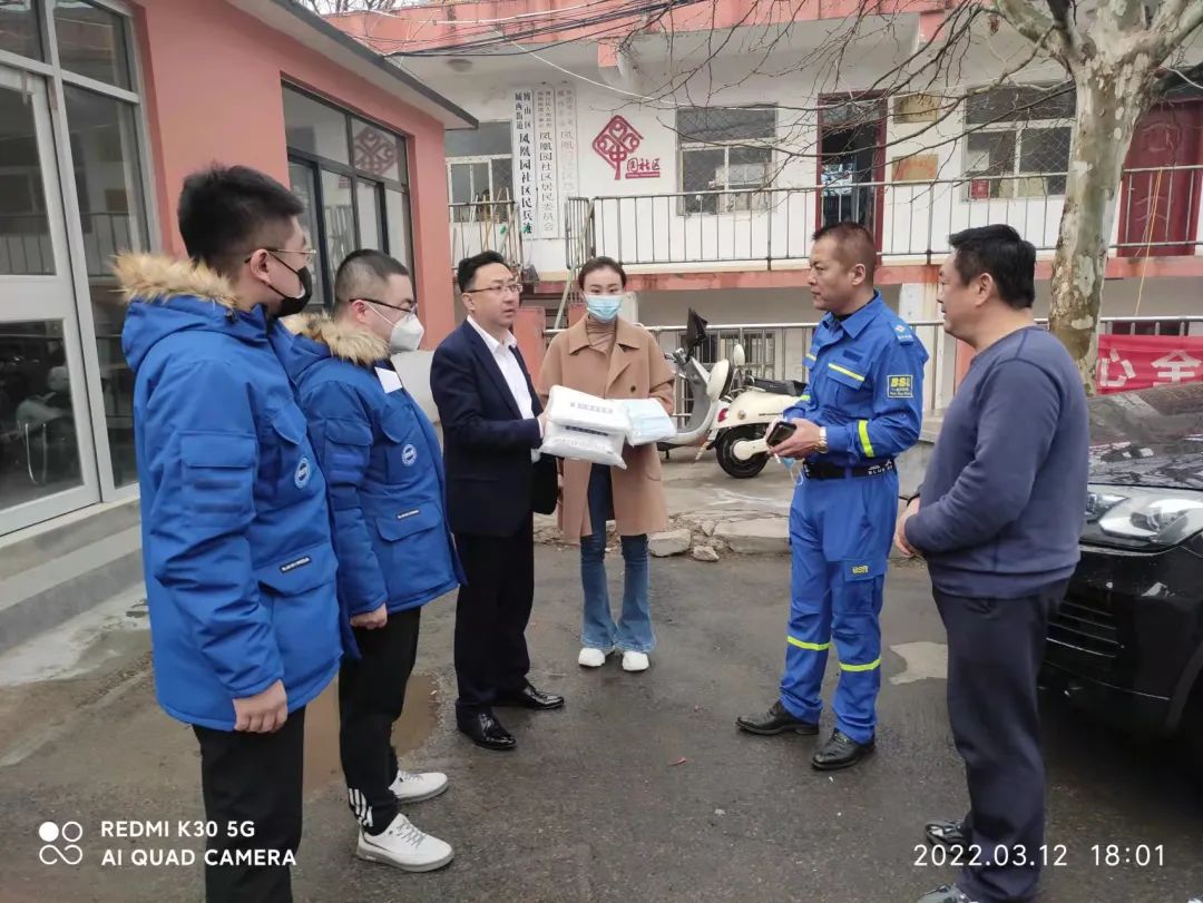 博山区工商联组织区小微企业家商会为2个社区送去额温枪、口罩、消毒液等医疗物资。